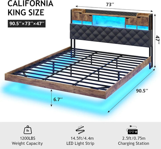 California King Floating Bed Frame with Storage Headboard