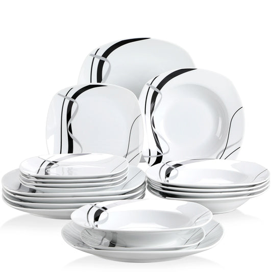 VEWEET FIONA 18/36-Piece Porcelain Ceramic Black Line Kitchen Tableware Dishes Plate Set with Dinner Plate,Dessert,Soup Plate