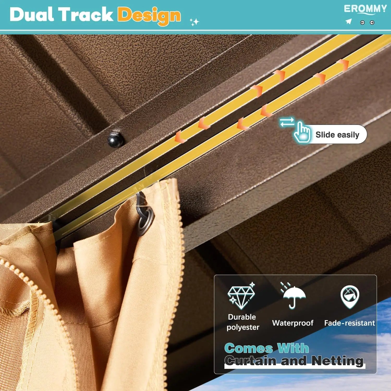 - [ NETTING & CURTAINS & HOOKS ] - Fully enclosed zippered double layer sidewall protect you from UV rays while adding more privacy. Gazebo canopy also has a double track system which allows you to slide each layer with ease. Top netting and netting zipper at four sides to give your family and children safe and cozy surroundings. Equipped with hooks on the top roof, it can be used to hang up the lights and fans to enrich the aluminum hardtop gazebo.