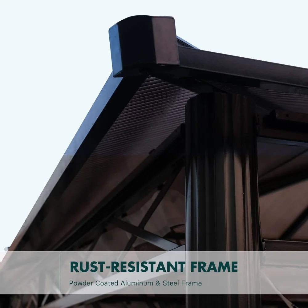 - HARD-TOP GAZEBO: Our Hardtop gazebo has three layer protection-allows. All-weather hardtop gazebo allows sunlight in while reducing heat and blocking 99% of harmful UV rays. The hard top canopy provides better stability in windy conditions.