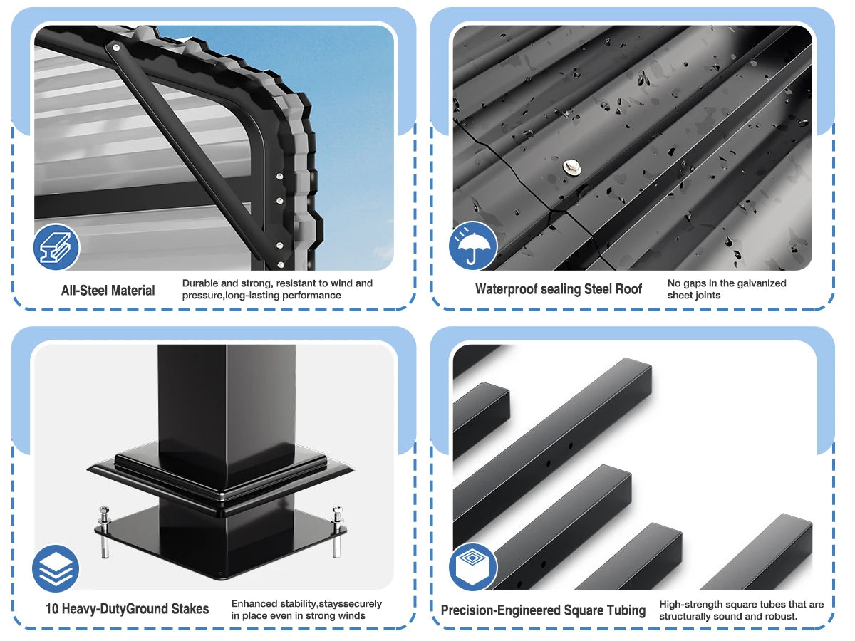 Reinforced Structure – Extra roof beams and side reinforcement bars increase load capacity and wind resistance. Includes heavy-duty anchor bolts for stable installation on various surfaces.