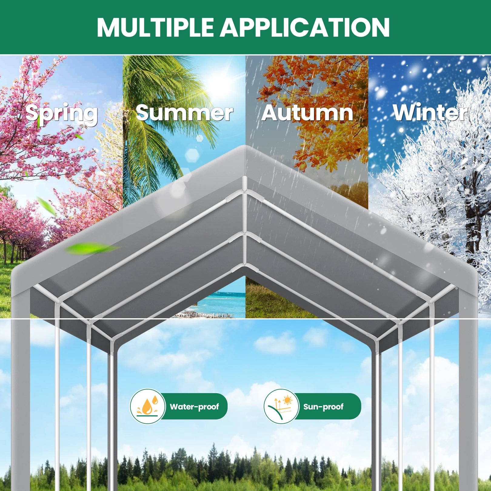 【Quality Fabric】 The tarp of our 10x20 carport, crafted from 160gPE material, offers excellent waterproof, ultraviolet-resistant, and tear-resistant properties. It is designed to provide year-round protection for your vehicles.
