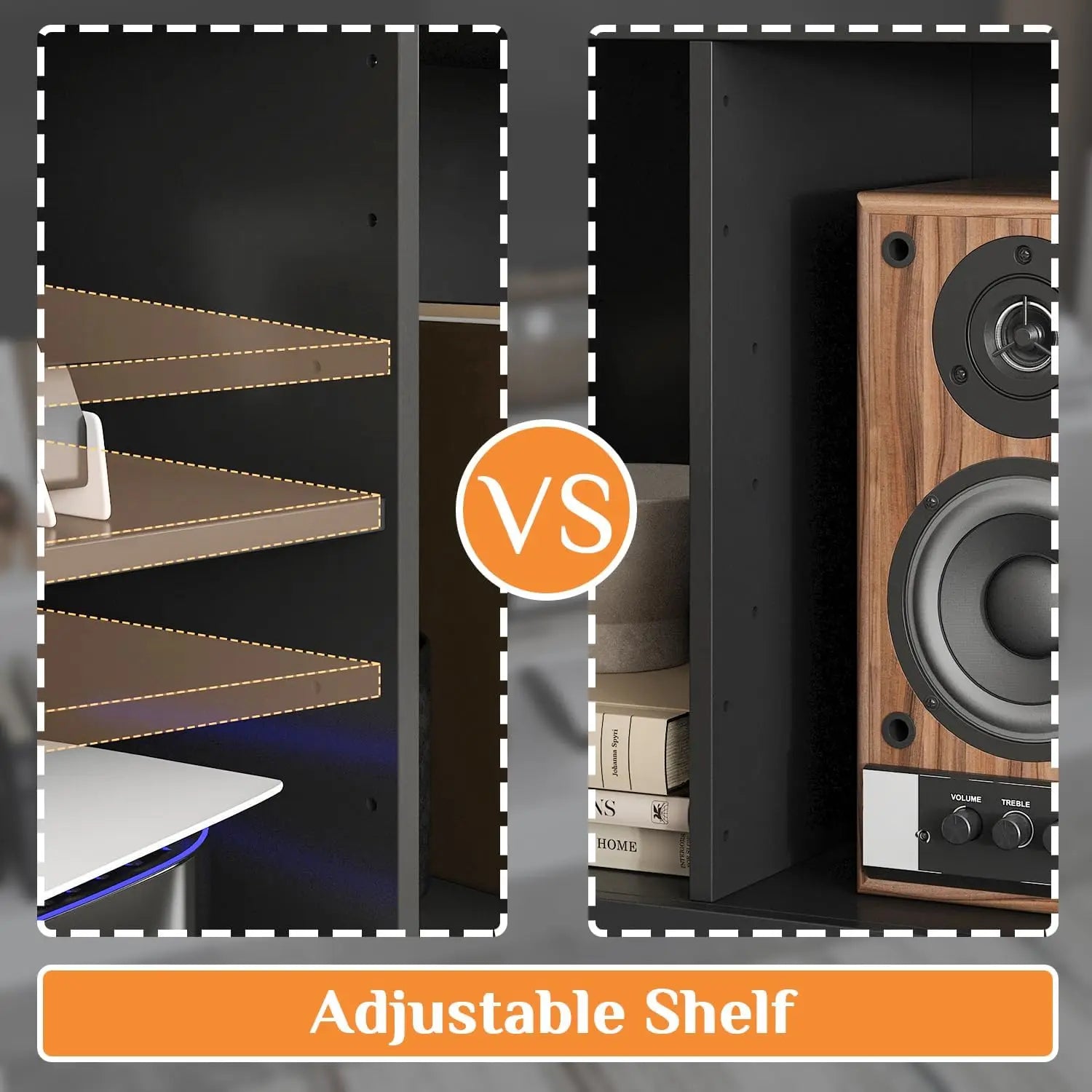 - [Large Storage Space] - This black TV stand for TVs up to 75 inches comes with ample storage space, it offers total 18 storage compartments, and the open shelf on the TV console table is adjustable with pre-drilled holes, you can easily adjust heights or remove the shelf to store larger items like fireplace. The doors on the top shelf are lift-up to open.