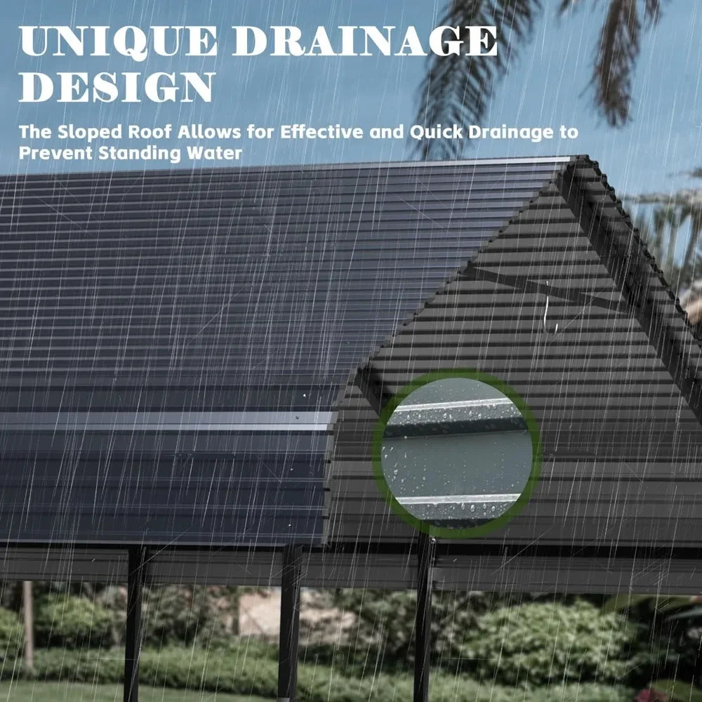 Heavy Duty Metal Carport: Compared with other similar products, the traditional tent-type roof is abandoned and replaced with color steel plates with a protective film on the surface to adapt to the changing outdoor weather. The carport is surrounded by strong square tubes for support, and the plastic parts are made of polypropylene to reinforce the overall stability of the metal carport.It also avoids product damage caused by collisions during transportation