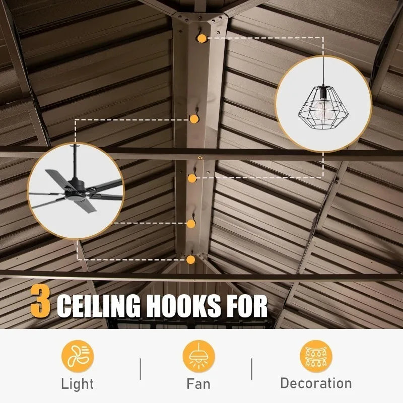 ❤️Stability and Durability- The galvanized steel metal top and sturdy aluminum frame provide the metal gazebo with the ability to withstand heavy snowfall in winter and offer unbeatable stability in windy conditions.
