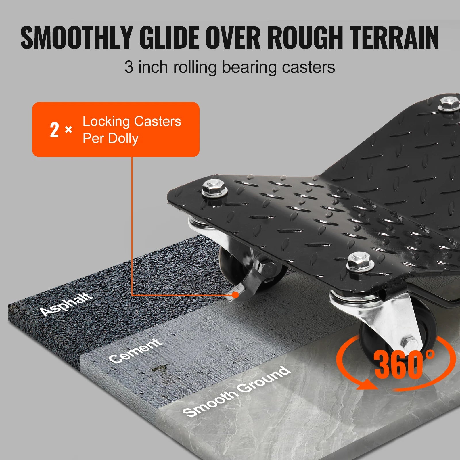 Easy Maneuverability: Featuring universal casters, this dolly provides smooth, 360-degree movement, making it easy to navigate tight spaces. The foot brake securely locks the dolly in place, enhancing convenience during vehicle maintenance.