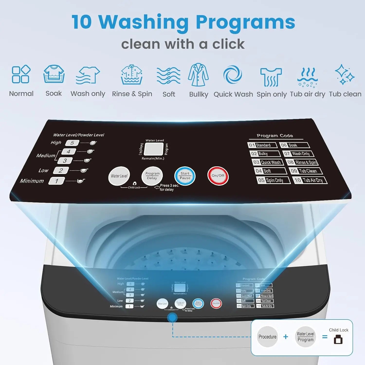 - 【Child lock & Ultra-Quiet】Intuitive LED control panel for hassle-free operation. Advanced noise-reduction technology keeps laundry time peaceful day or night. VCJ full-automatic washer(2 in 1) care about your family. Child Lock feature allows you to freeze the control panel to make sure everything goes right. Simply press and hold the “Procedure” , “Water level/Program” button together, the control panel will no longer respond unless the press and hold again.