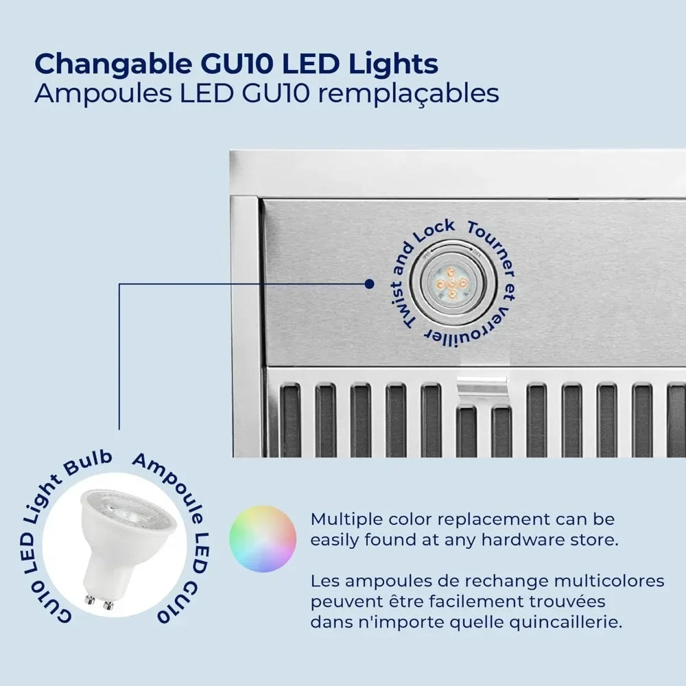 HIGHLY-CUSTOMIZABLE SETTINGS: Customize our kitchen hood 30 inch performance through 6-speed settings to set suction and noise levels. The standard 2700K light color gives off a warm glow but can be swapped out to match your kitchen’s lighting scheme.