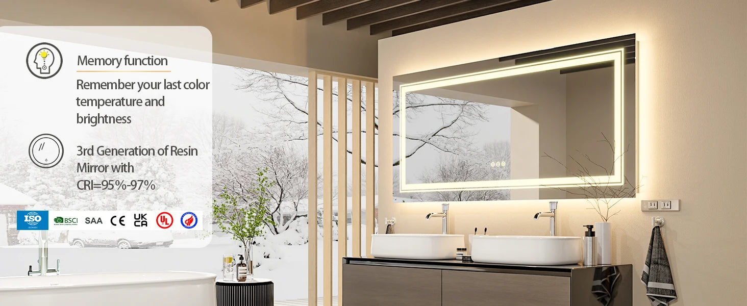 【Quick Installation】The light up mirror is made of thicker HD glass and aluminum shell for being sturdy and safe for use, no flying fragments when broken, with a standard plug, you can power on through the plug, or asks professionals for help, cut and connect the hard wire for wall switch