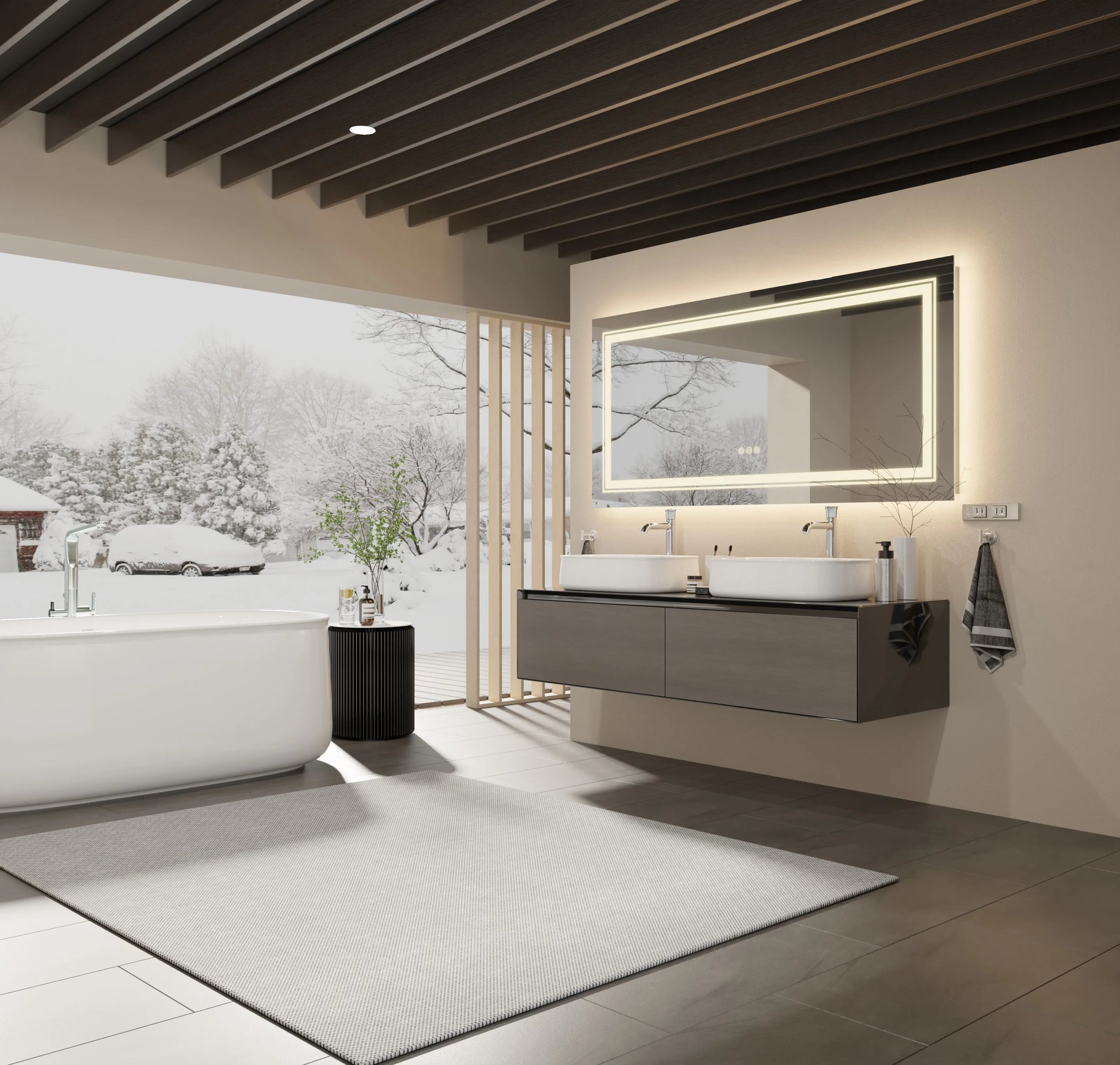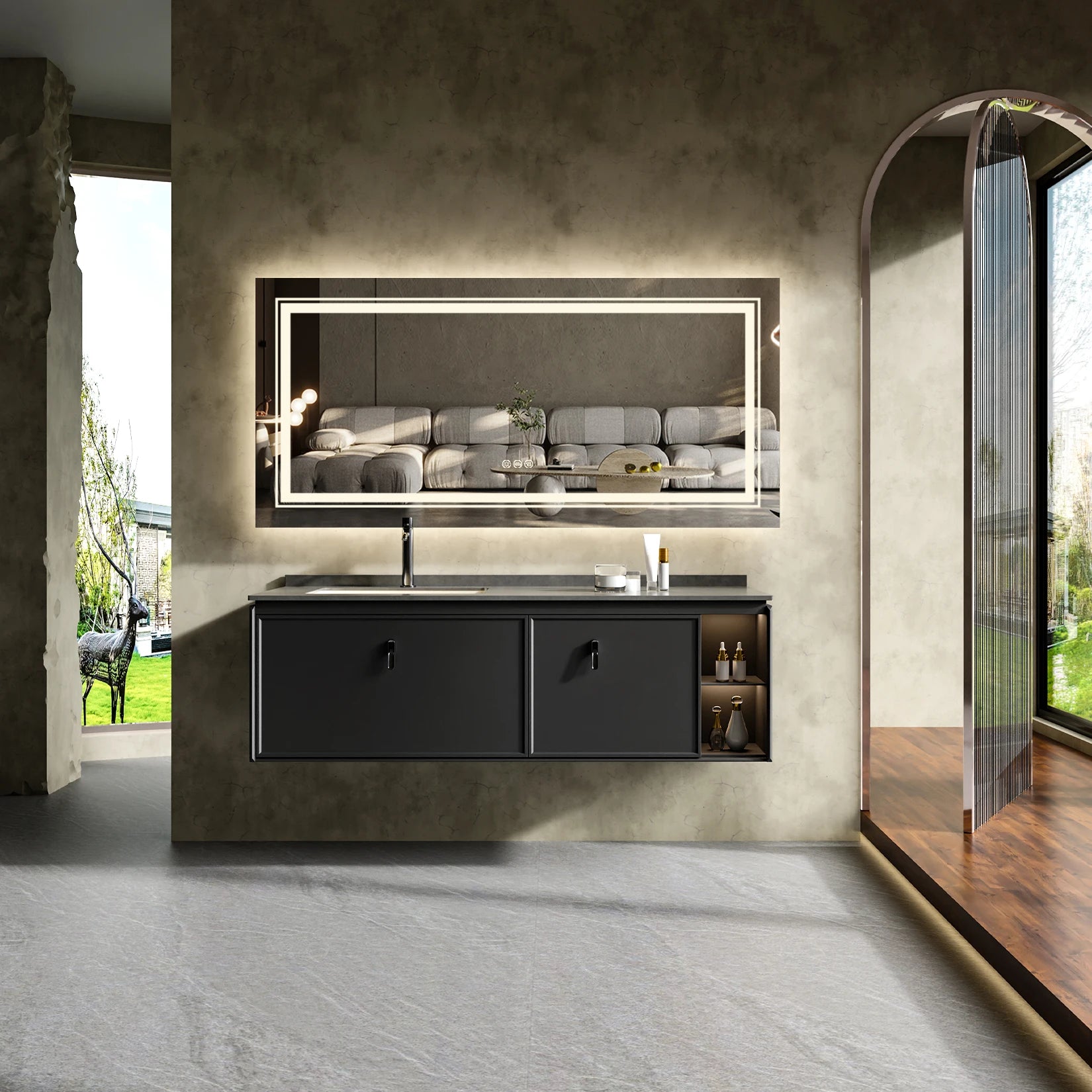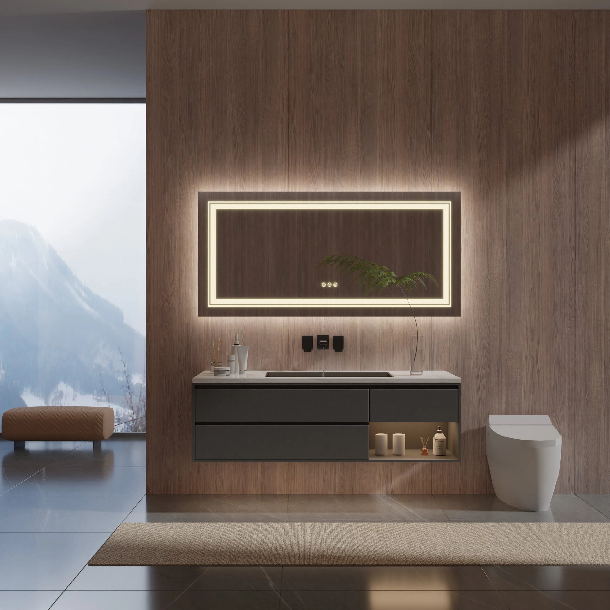 【Easy To Use Touch Switches】Illuminated mirror with three touch control on the screen, simply tap the button to adjust 10%-100% brightness levels and 3 lighting setting - cool white, warm and natural white to suit your tasks, defog function keep the fog away from mirror within 5 min