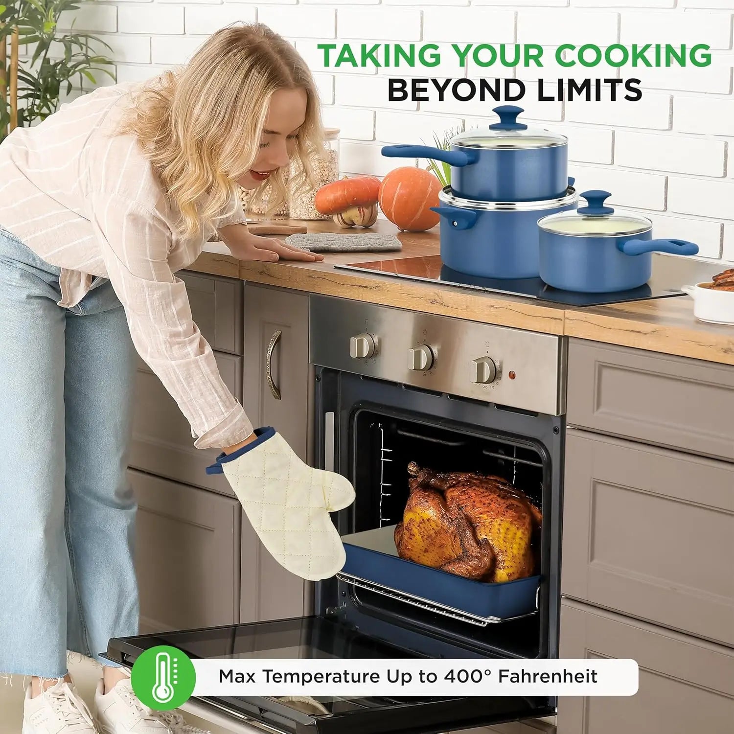 - USER-FRIENDLY DESIGN - Embrace eco-conscious cooking with our food-grade, user-friendly kitchenware. This nonstick pots and pans set is thoughtfully constructed for use on gas, electric, ceramic, and induction (excluding the small egg pan and milk pot) cooktops.