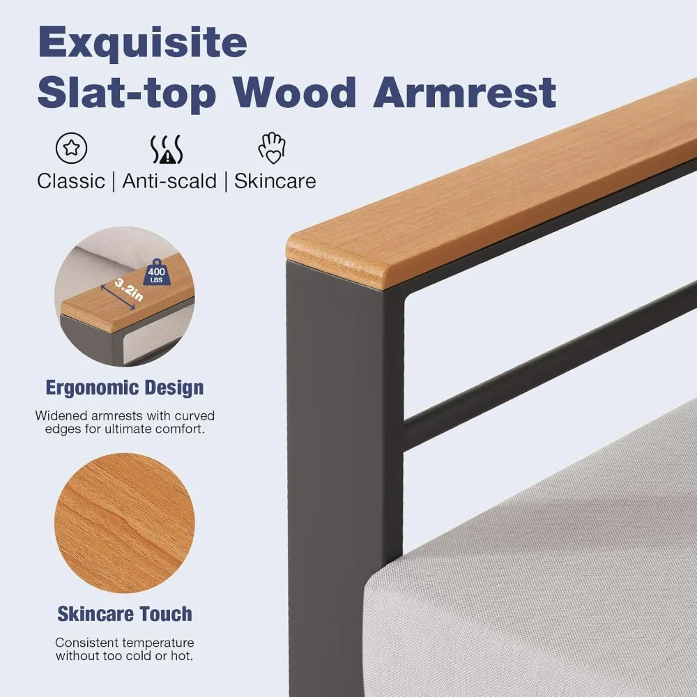 - 【UPGRADED】① Wider 26 in seat Thicker 5 in cushion, industry standard 24 in 5 in; ② Reinforced Structure, Hurricane-grade steel frame with thickened support beams; ③High-end a luminum with heat treatment wood grain coating, more fashionable and reduce the metal heat in summer, protect the skin; ④Top Olefin fabric, easy to clean, ten years without fading