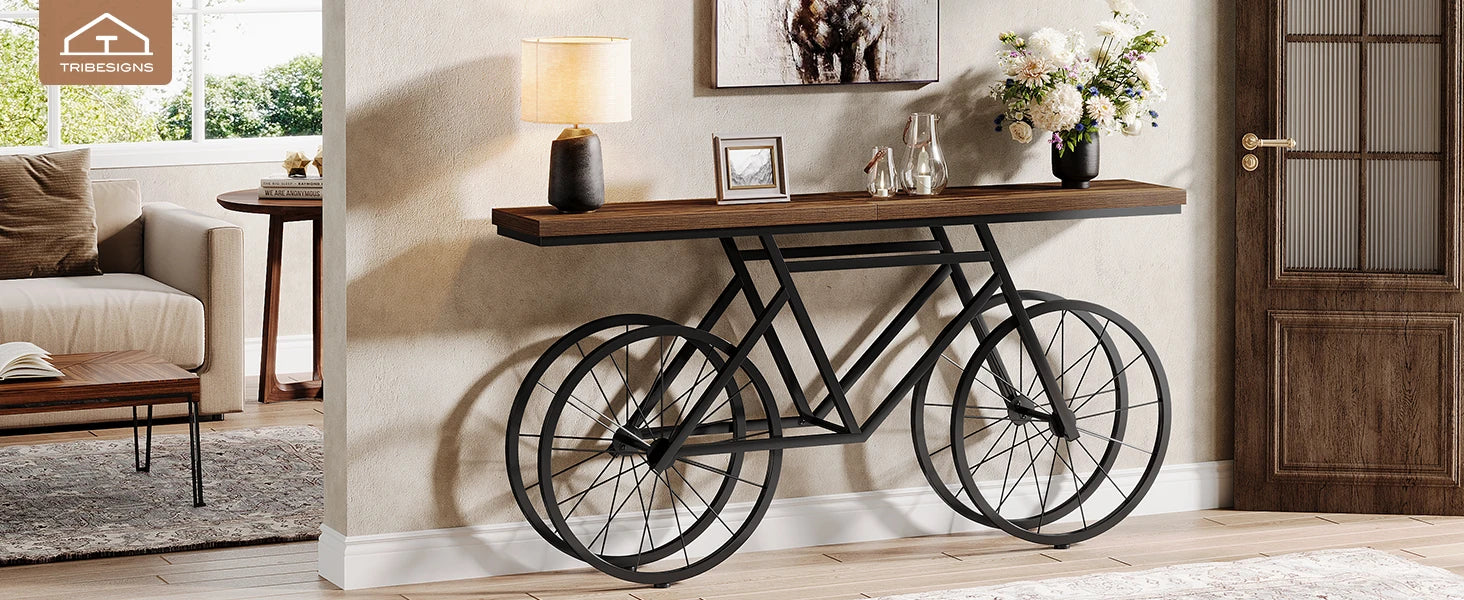 Eye-Catching Design: The audacious charm of this entryway table breathes new life into your space, transforming it into a creative haven. Its unique bicycle metal base is the epitome of innovative design, adding an unconventional yet stylish twist. The combination of the warm wood tone and the edgy metal frame creates a chic and sophisticated look that complements a variety of decor styles.