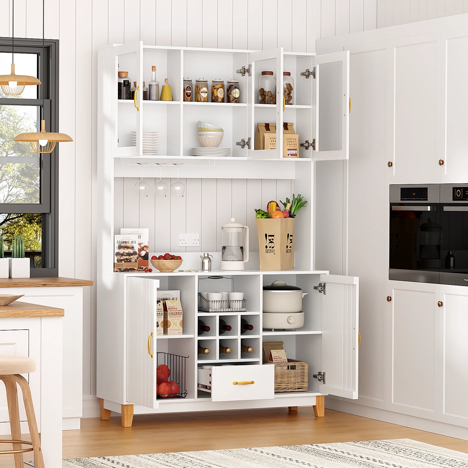 【SPACIOUS STORAGE SPACE】Dimensions: 47.2"W x 15.7"D x 78.7"H. Our kitchen pantry is designed with 5 cupboards, 1 drawer and an open microwave countertop to give you plenty of storage space. Additionally, the kitchen cabinets come with cup holders and wine racks, making it easy to hang wine glasses or store wine bottles.