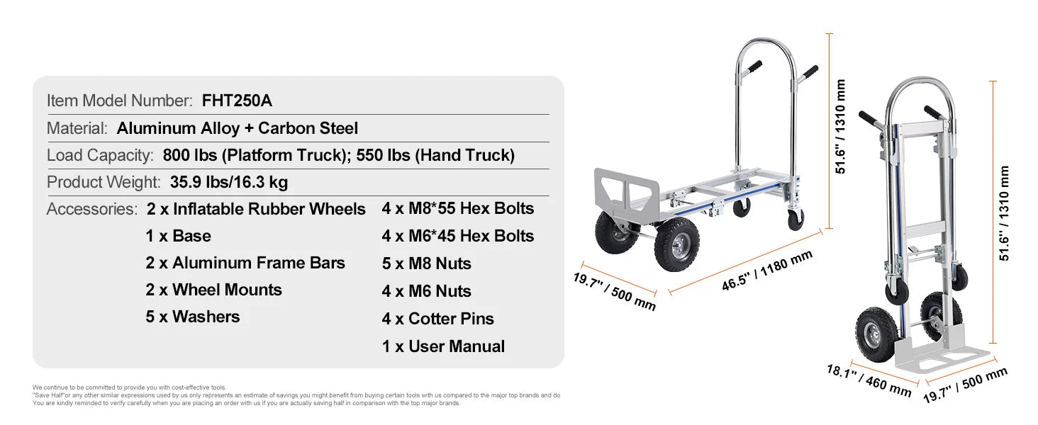 High Load Capacity: Ready for some heavy lifting? Meet your new best friend. With a hearty weight range of 300lbs / 550 to 800 pounds /800 to 1,000 pounds, this hand truck won't break a sweat for hauling, carrying, or transporting. Platform Truck Mode Size: 19.6"L x 46.4"W x 40.5"H; Hand Truck Mode Size: 19.6"L x 18.1"W x 51.5"H.