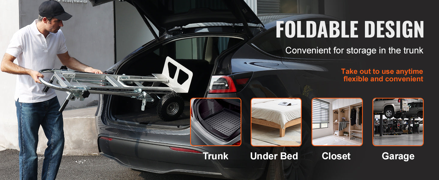 Snap, Fold, Store: Done for the day? Our wheels pop off in a jiffy. Fold it flat and slide it under the bed or in the garage. This heavy duty hand truck is perfect for indoor and outdoor loading or moving tasks, such as in warehouses, gardens, construction sites, supermarkets, and offices.