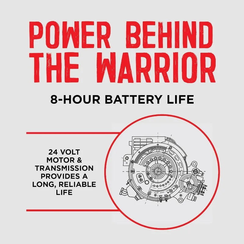 Battery: Powerful, 24-volt rechargeable battery-operated drive system. Comes with an illuminated battery power level indicator. Use a standard 120v AC outlet to charge. 2 sealed Acid Glass Mat 9Ah batteries.