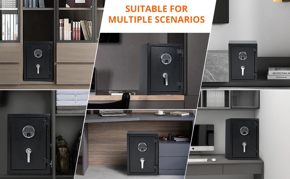 【Product Dimensions】:The Exterior Dimensions of the safe: (D)13.7X (W)14.1 X (H)19.6 in; the inner Dimensions: (D)11.4X (W)12.5 X (H)18.1 in. The home safe is also equipped with a removable shelf and drawer which can load documents, laptops, pistols, cash, and medicine.
