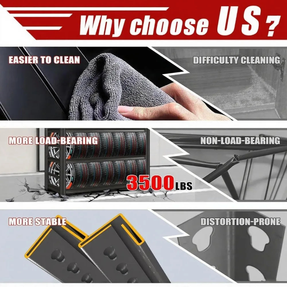 - 【Heavy-Duty Steel Construction】Built with durable cold-rolled steel, this garage shelving unit features thickened uprights and cross beams for reliable stability. The scientific frame design of this metal shelving evenly distributes weight, minimizing concerns about shifting or bending—making it more sturdy than common plastic or wooden storage shelves. With a 3800-lb capacity, this metal shelving system is a practical solution for garage storage needs, pairing well with other garage shelves for organized space