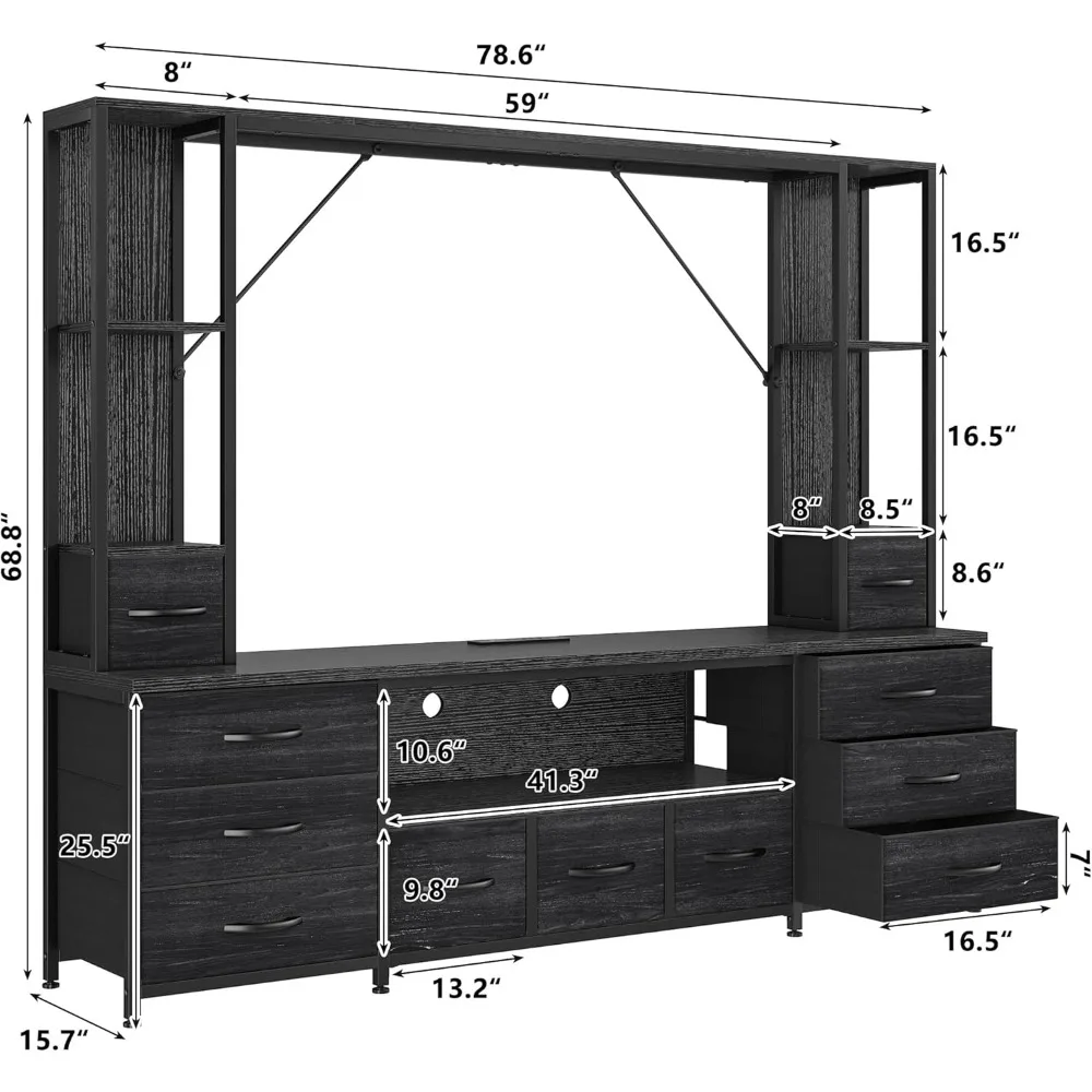 - 【Sturdy, Stable and Safe】Our Tv stand with drawers are very sturdy with a total load of 406 pounds.This bedroom dresser is made from sturdy metal frame and thicken wood top to provide stable support and ensure years of use. The chest of drawers is made of high quality durable fabric drawers, so the dresser for bedroom can be pulled out and closed smoothly. This TV table comes with a secure anti-tilt kit and 8 support rods to prevent tilting, ensuring your TV cabinet will remain stable and secure.8 adjustable feet can prevent wobbling on uneven floors and protect the floor from scratches.
