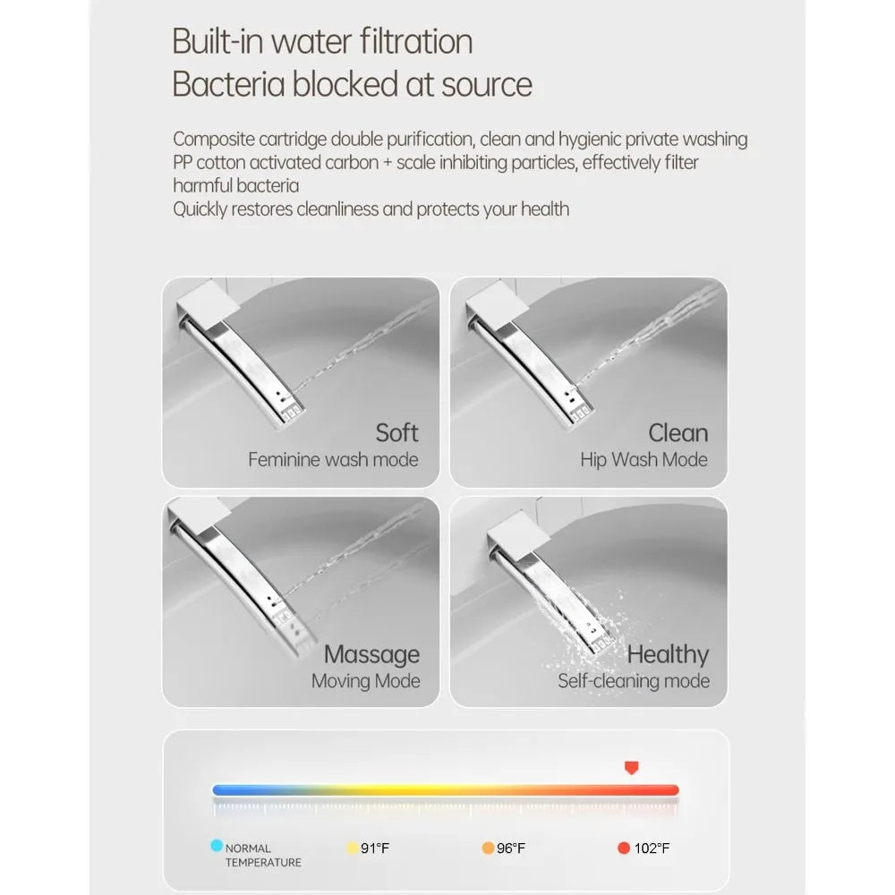 - Multiple cleaning modes: provides buttocks cleaning, feminine cleaning, mobile cleaning (front and back water flow) and massage cleaning, with built-in filter to ensure thorough and hygienic cleaning