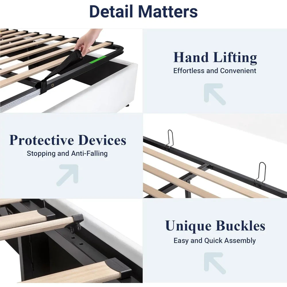 - Space-Saving Storage: With its lifting up storage feature, this bed frame provides ample space to store extra bedding, clothing, shoes, and other items, especially helpful for smaller bedrooms or apartments where storage space is limited