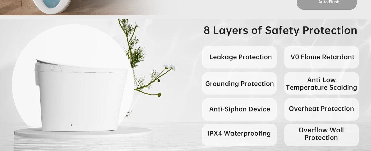 【Comprehensive Functions】Integrates multiple smart toilet features for enhanced convenience and comfort: Foot-Activated Lid and Seat、Wash Function、Child Wash Mode、Heated Seat、Seasonal Temperature Control、Dryer、Deodorizing、Night Light、Pre-Wetting、Foot-Activated Flush、Auto Close&Flush、Emergency Flush and Digital Display.
