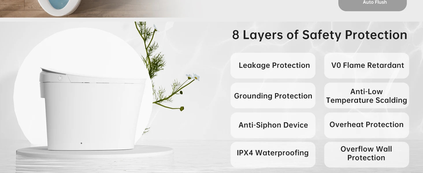 【Five Flushing Modes】Offers various flushing options to meet different user needs: Button Flush、Emergency Flush、Remote Flush、Off-Seat Flush and Foot-Activated Flush