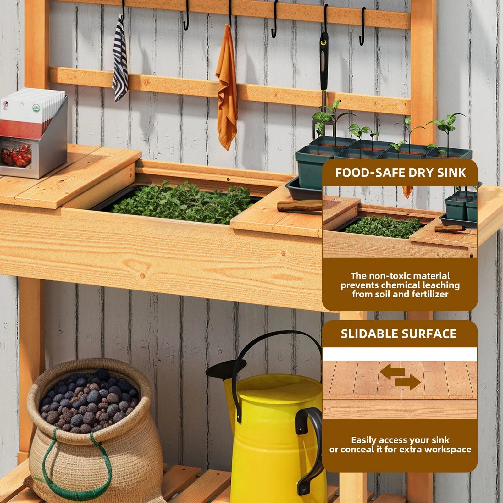 Get ready to elevate your gardening game with this versatile potting table, crafted from durable Spruce wood. Its solid build supports up to 55 lbs on both the tabletop and lower shelf, providing a reliable workspace for all your planting tasks. Need more space? Simply expand the tabletop to reveal a built-in plastic planting basin, great for reducing mess. The smart design includes a top shelf for pots, 8 hooks for tools, and a slanted lower shelf for bigger items. Easy to clean and built to last, this bench is your optimal gardening companion.