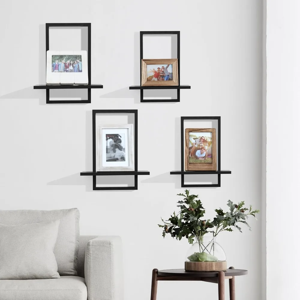- Decorative shelves: This frame shelf is great for displaying your favorite green plants,trophies,vases,decorations,and photos.Whether in the living room,bedroom,study room,these modern wall shelves will make your items more chic and eye-catching